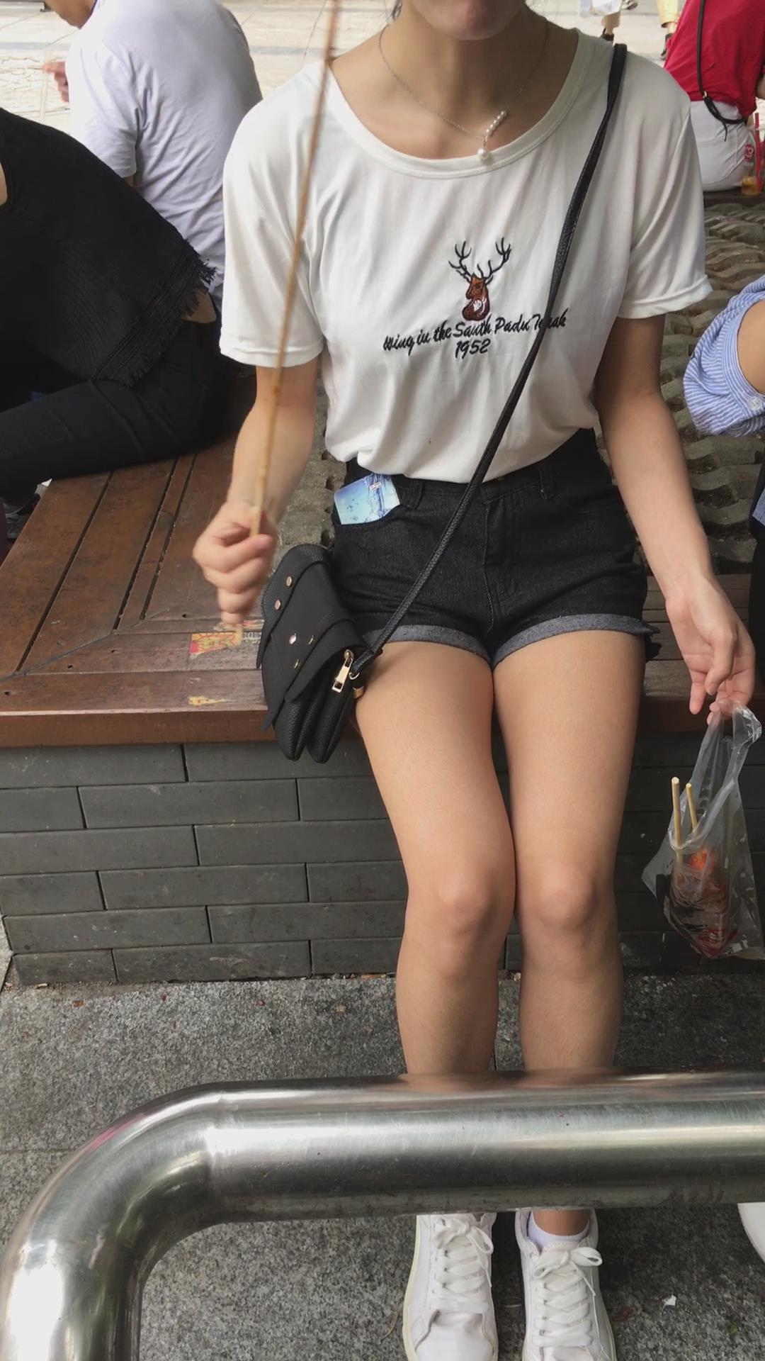 街拍白皙嫩腿热裤美眉,路边跟姐妹撸火腿肠 编号4514