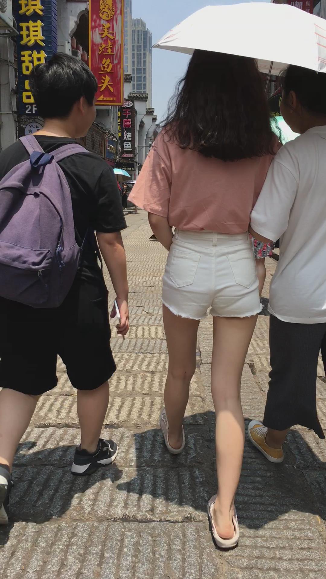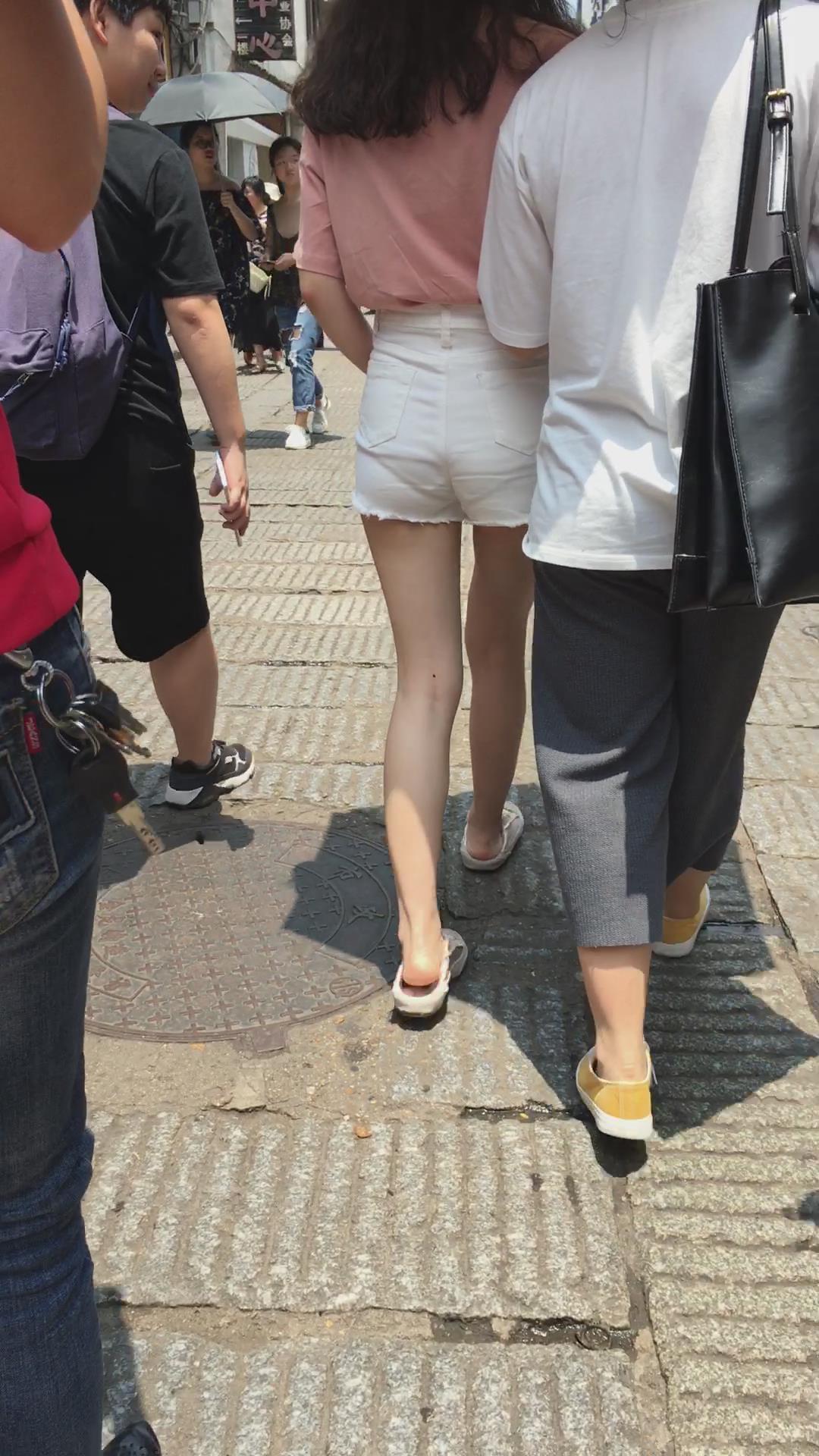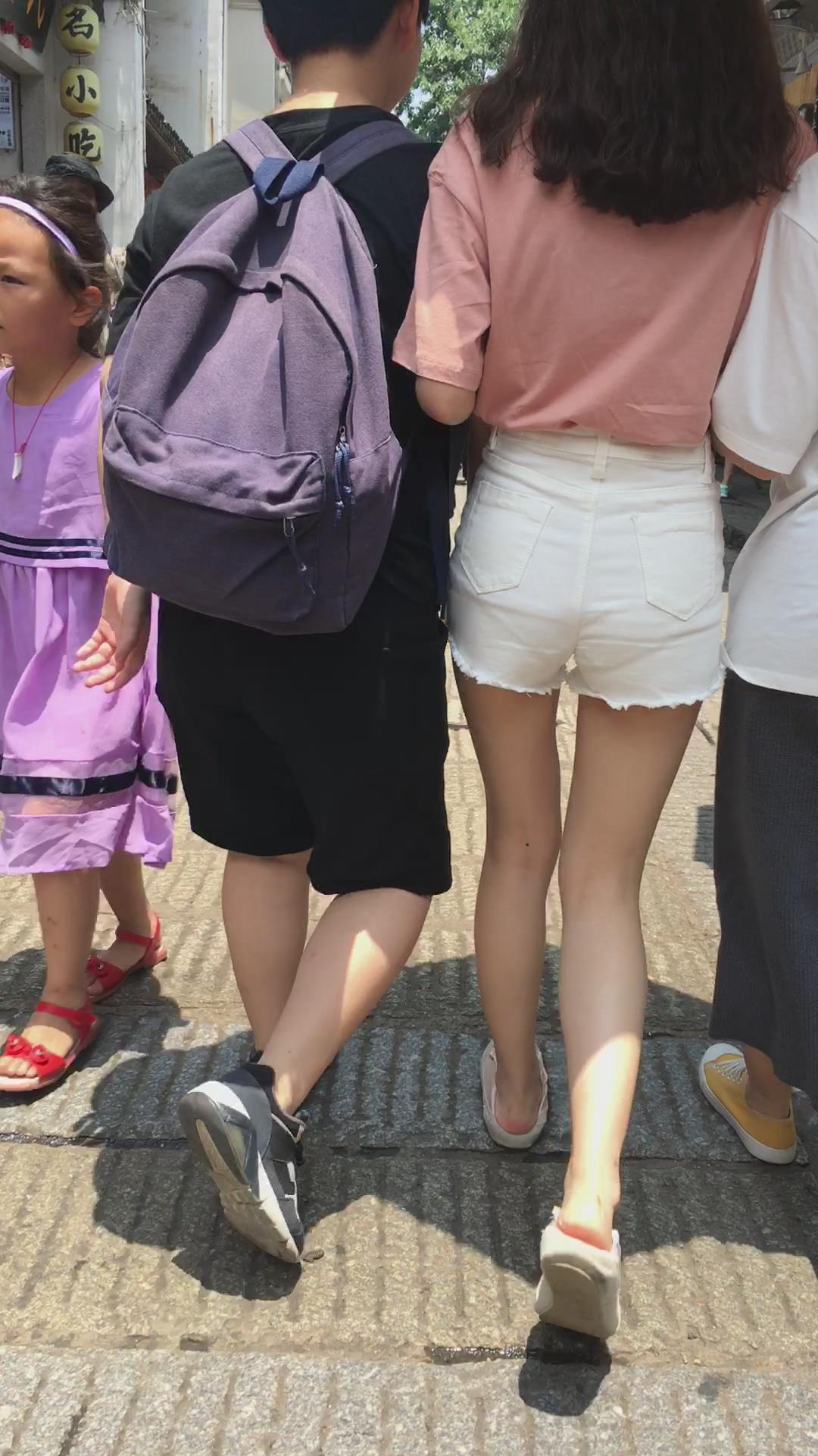街拍粉衣高腰白色热裤美眉,内内印痕清晰 编号4524