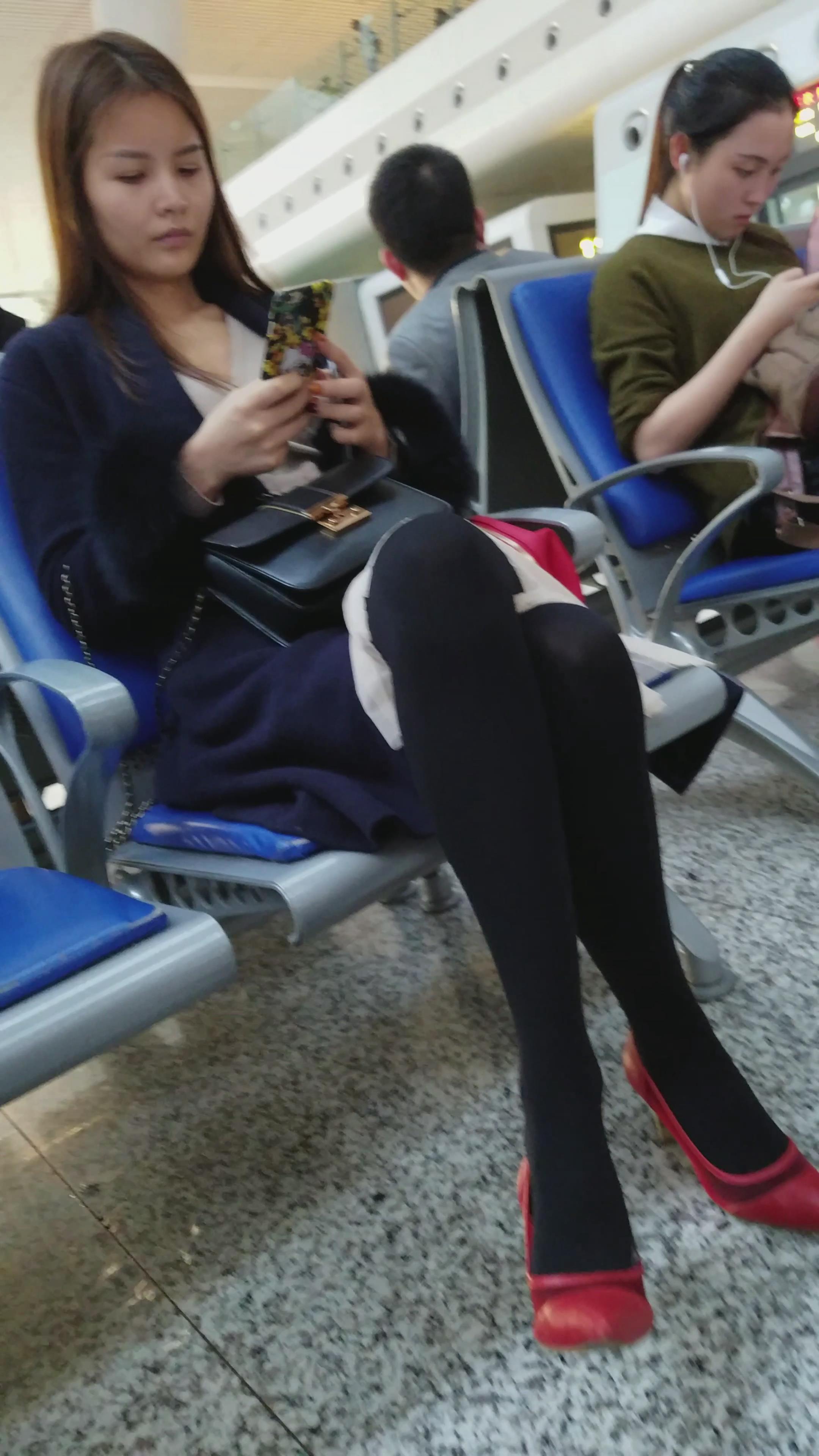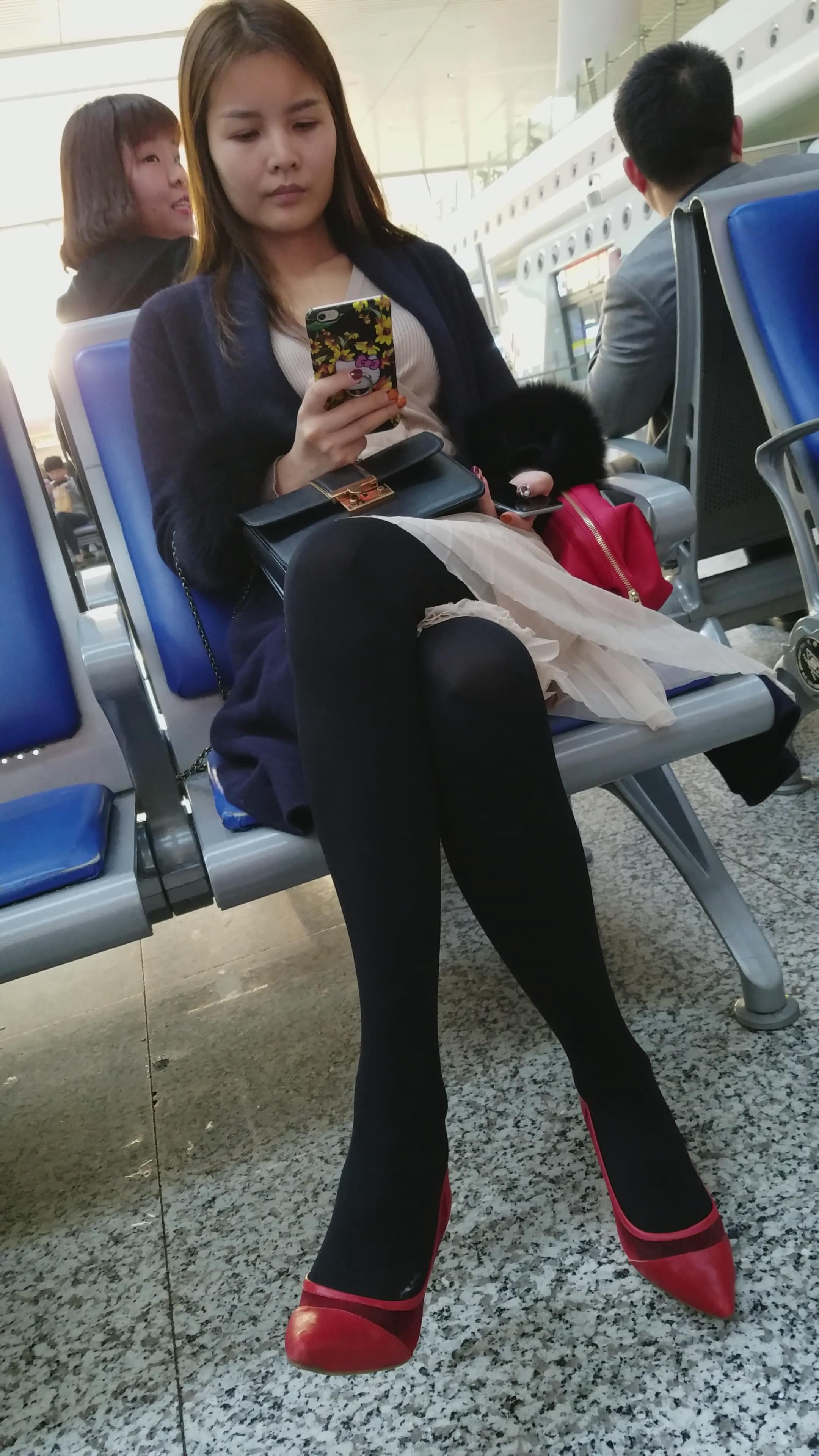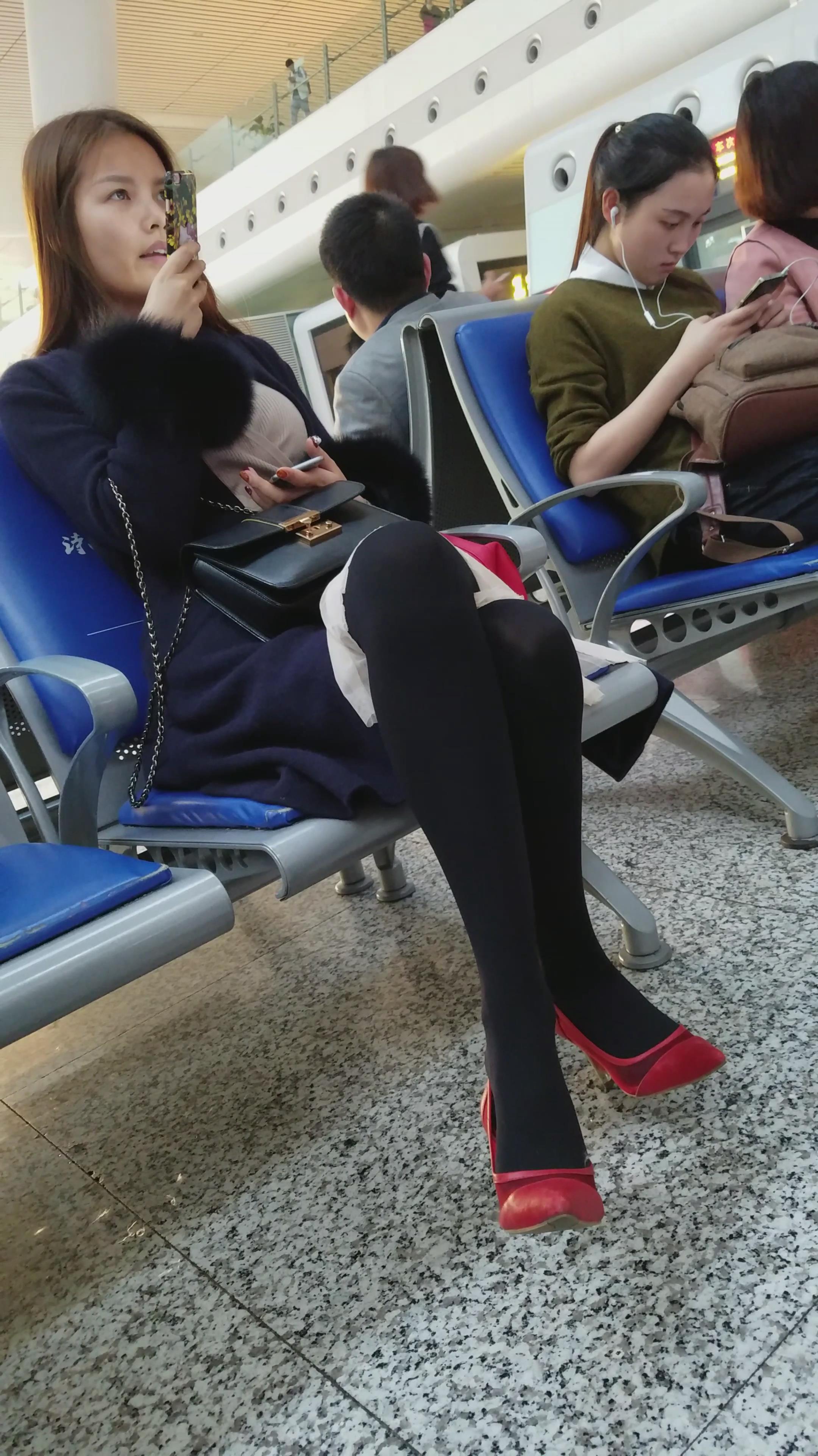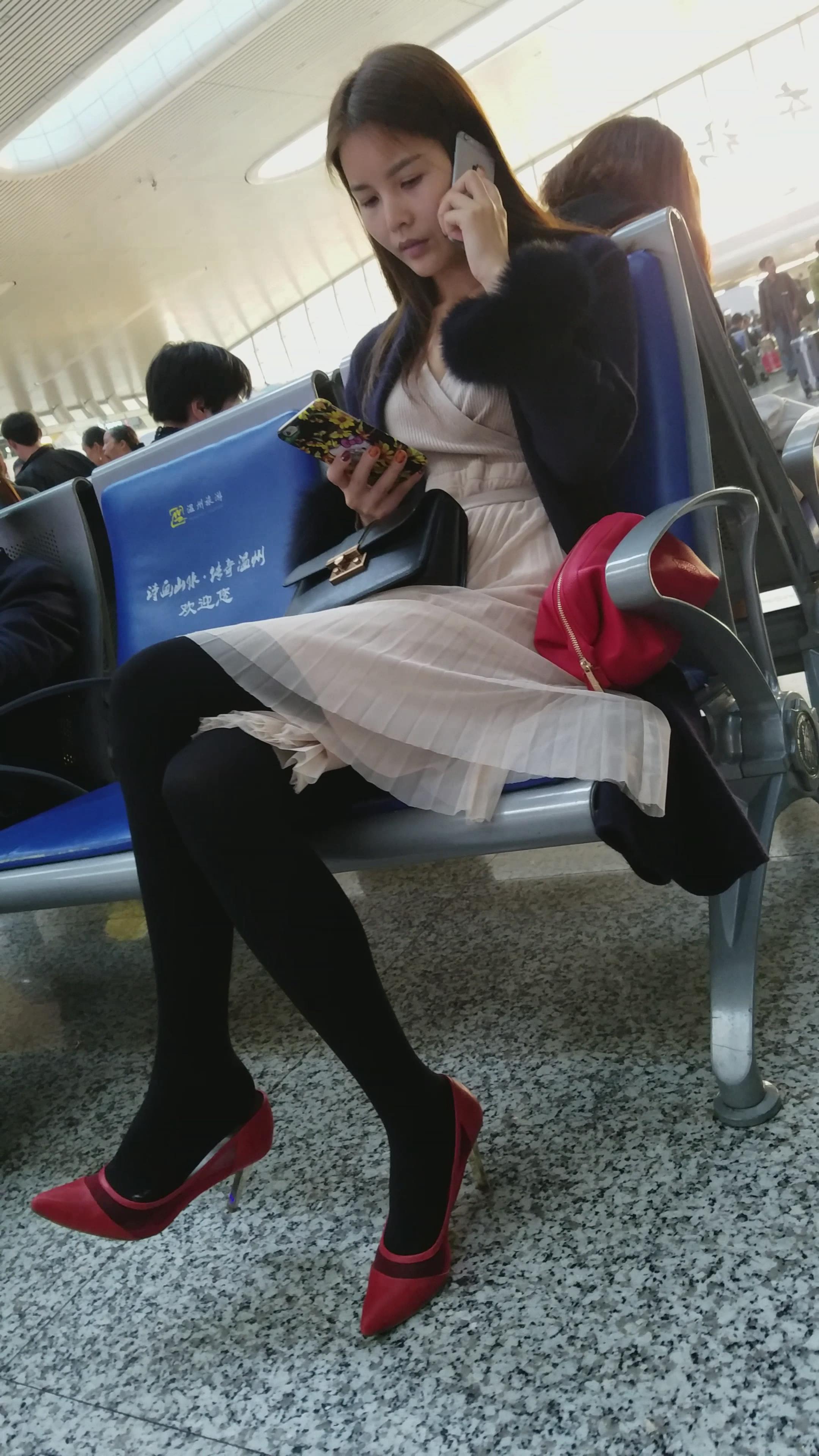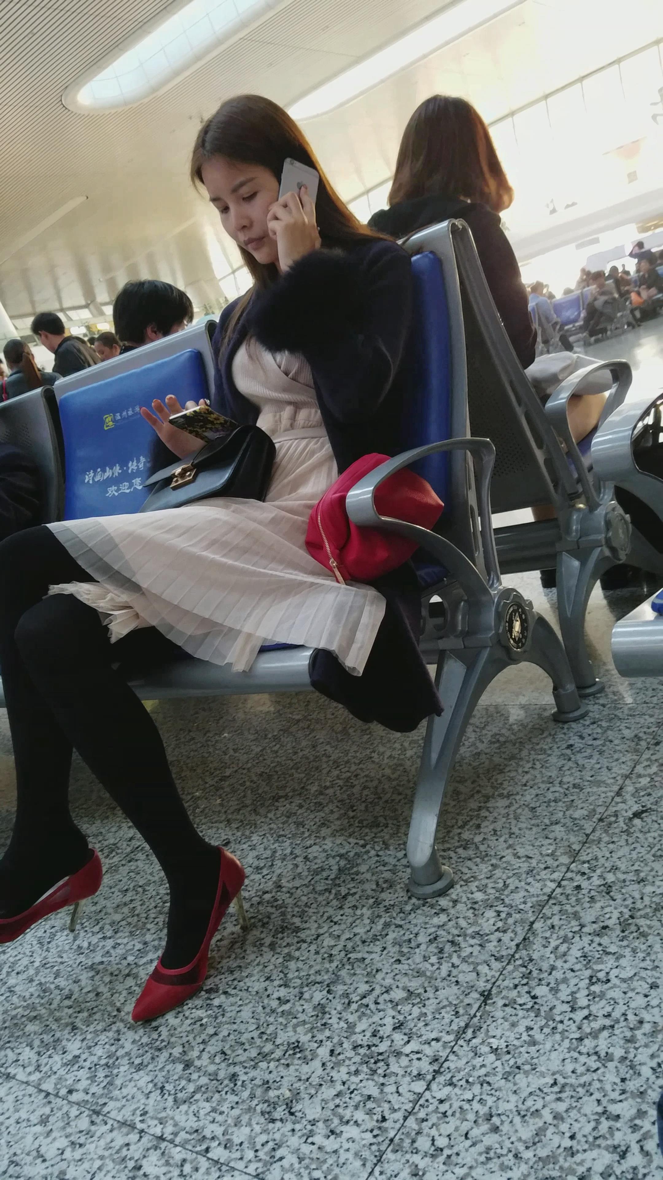 4k-高铁站候车室拍摄长腿尖嘴高跟鞋正在打电话的美女 编号2995