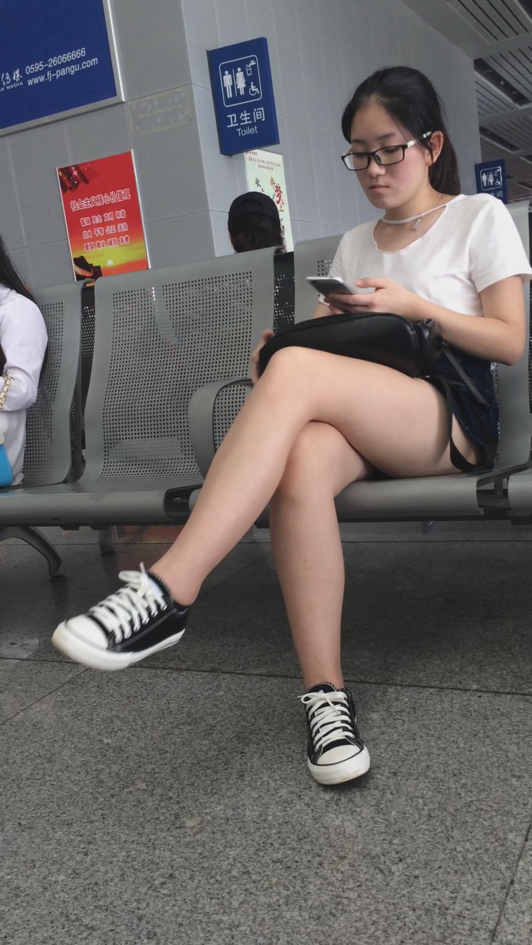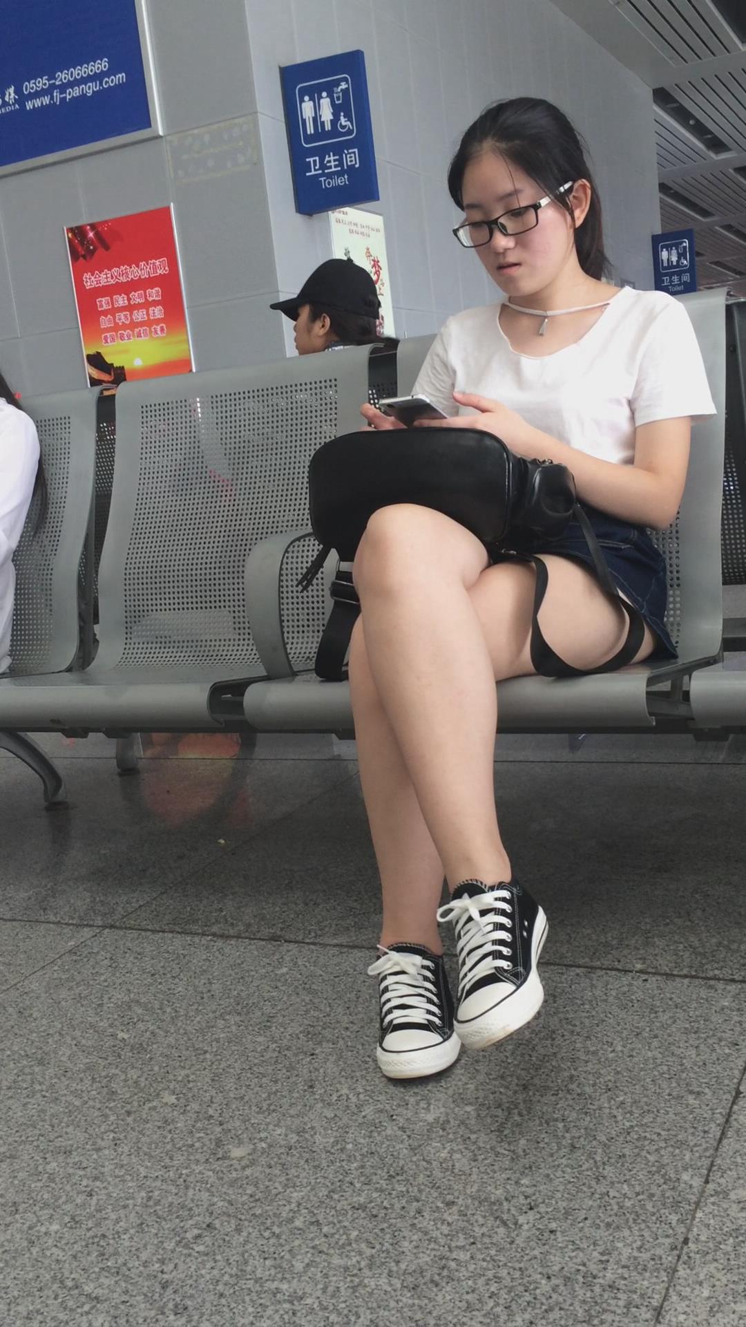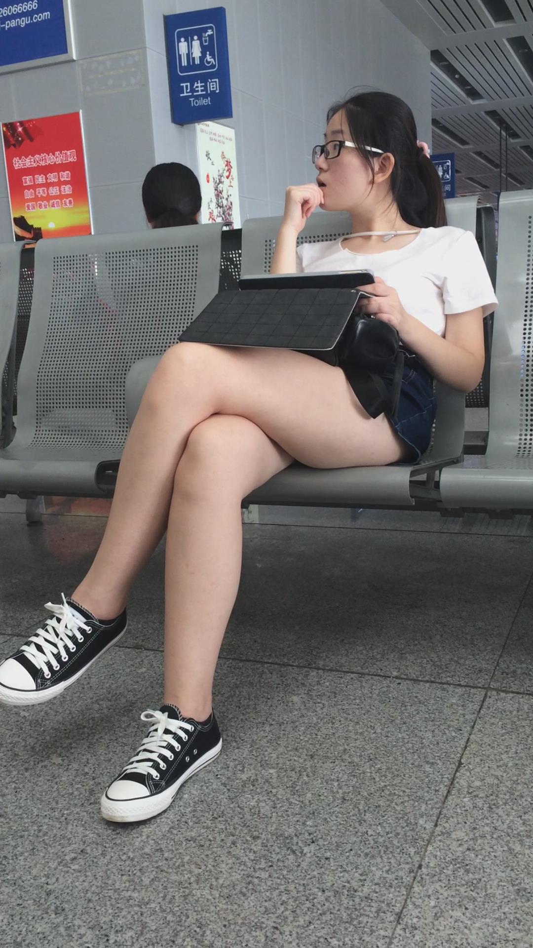 高铁候车室拍摄白腿帆布鞋眼镜妹 编号3009