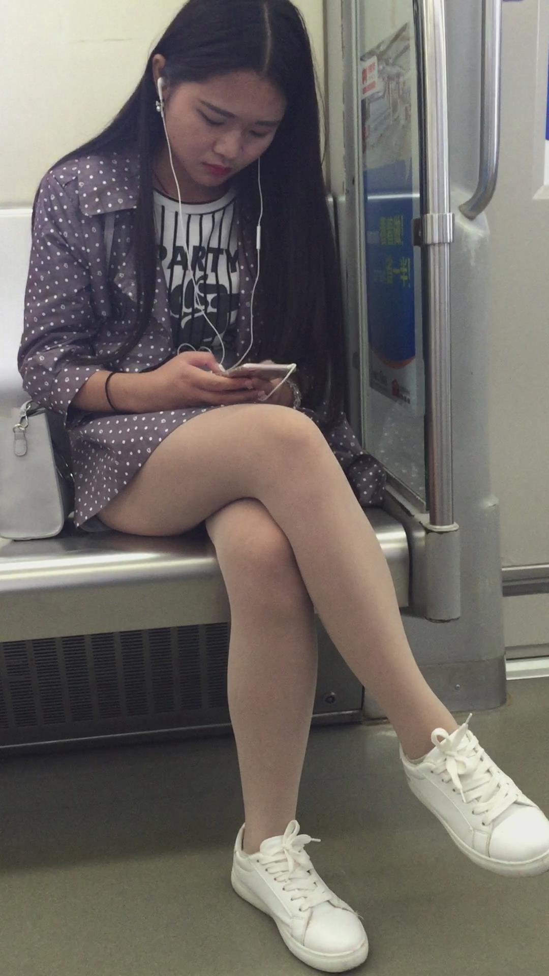 地铁上清纯漂亮的肉丝丝袜美腿板鞋少女低头玩手机 编号3092