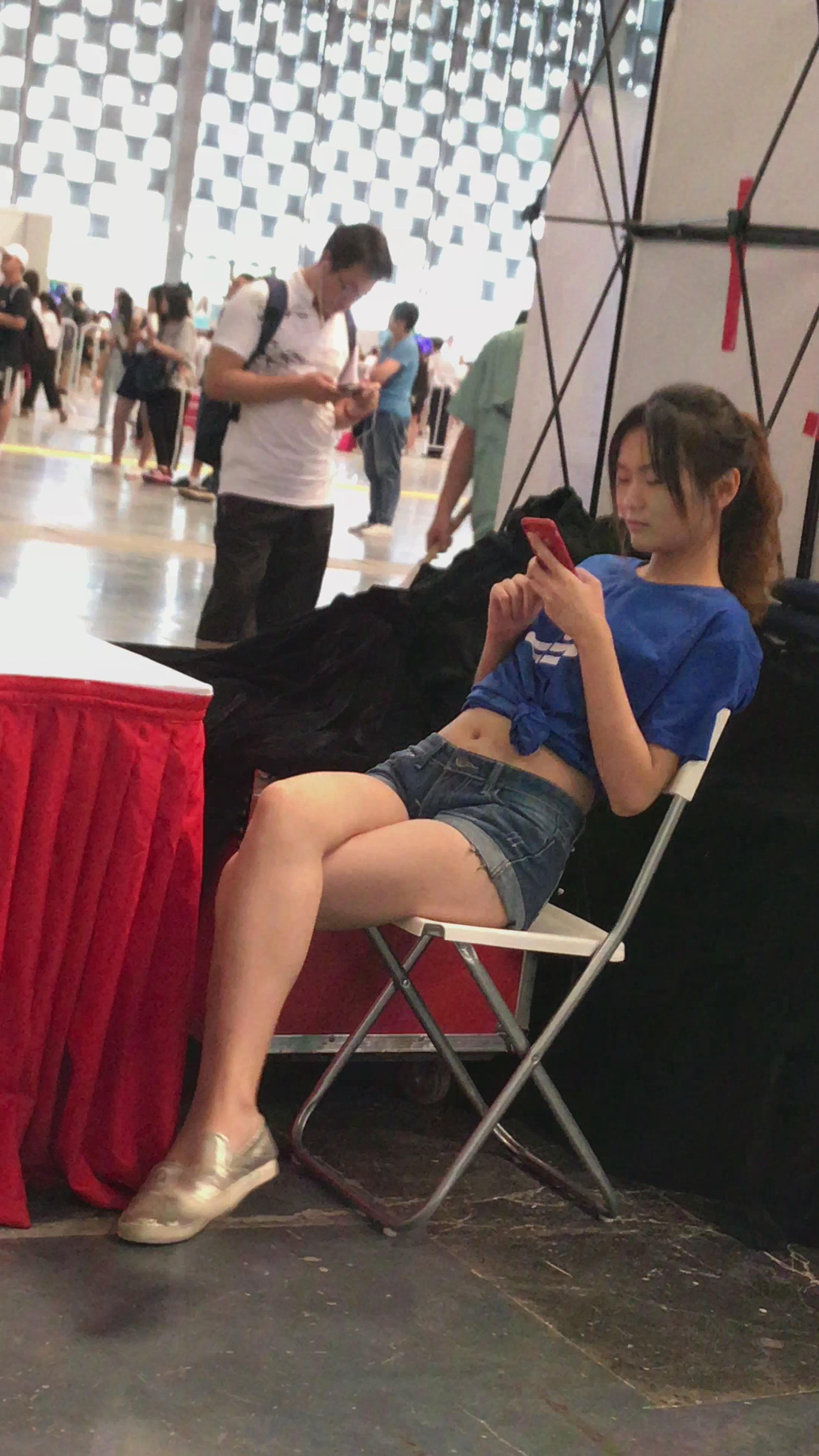蓝T恤热裤露脐气质小姐姐微笑更甜美 编号4064