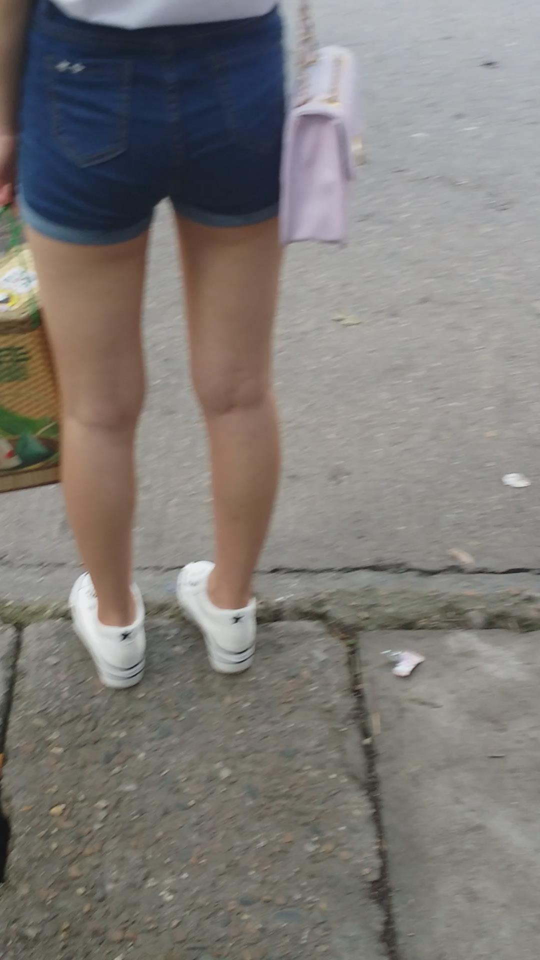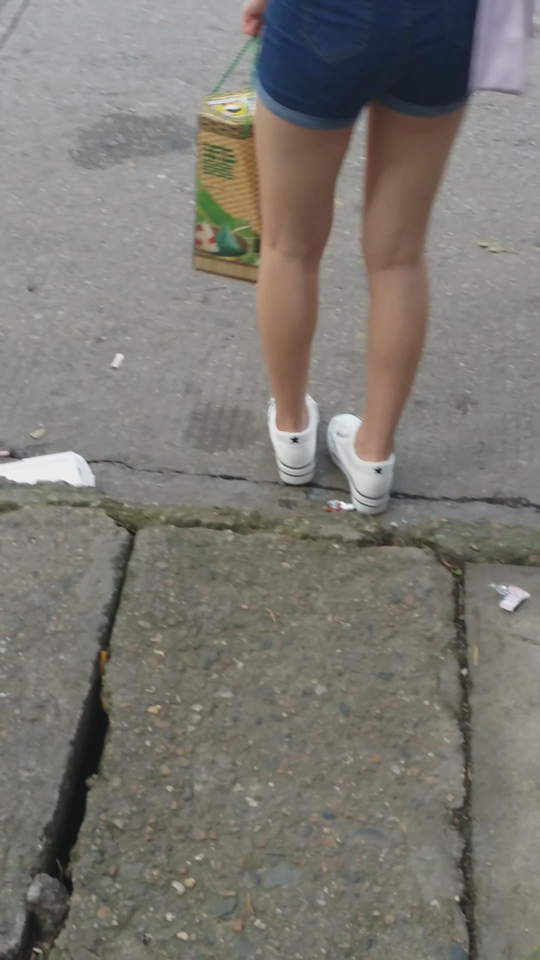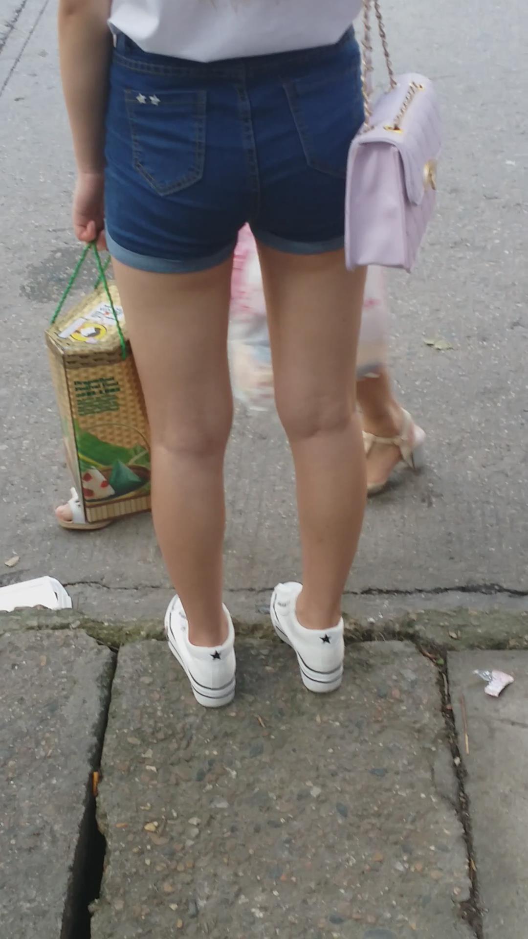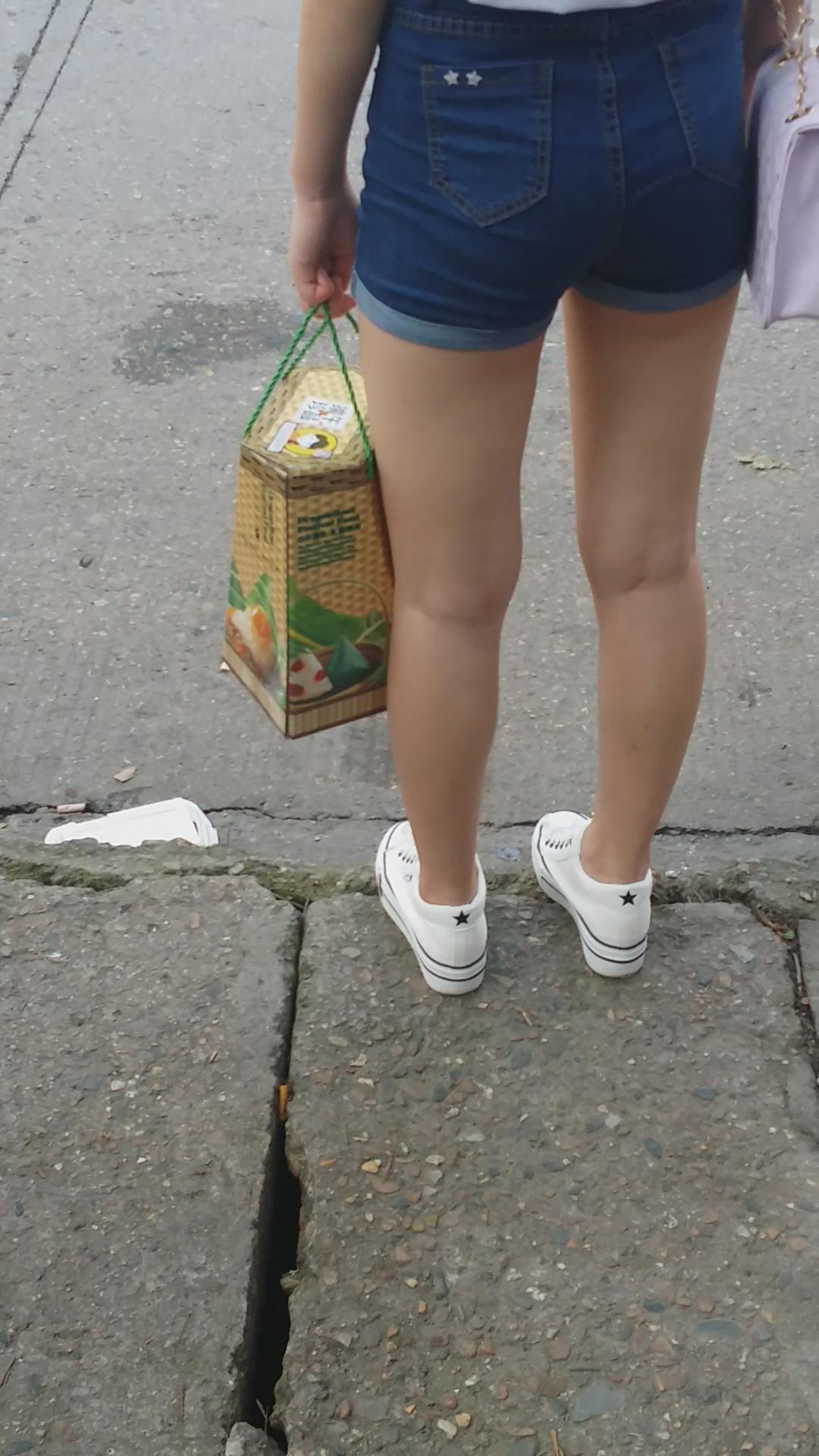 街拍高腰牛仔热裤美眉在路边等公交车 编号4078
