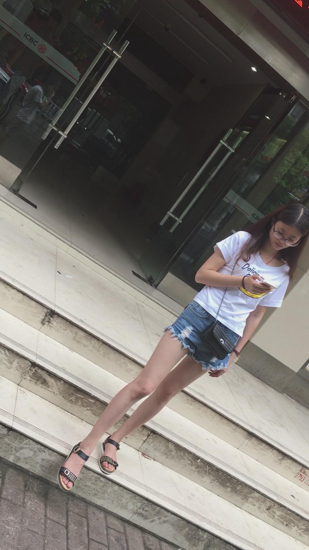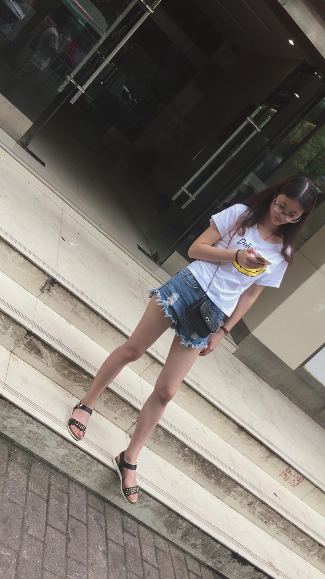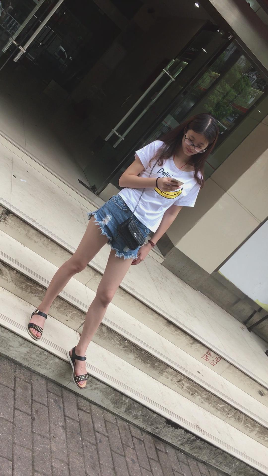 广场上在等人的白T恤热裤眼镜妹 编号4096