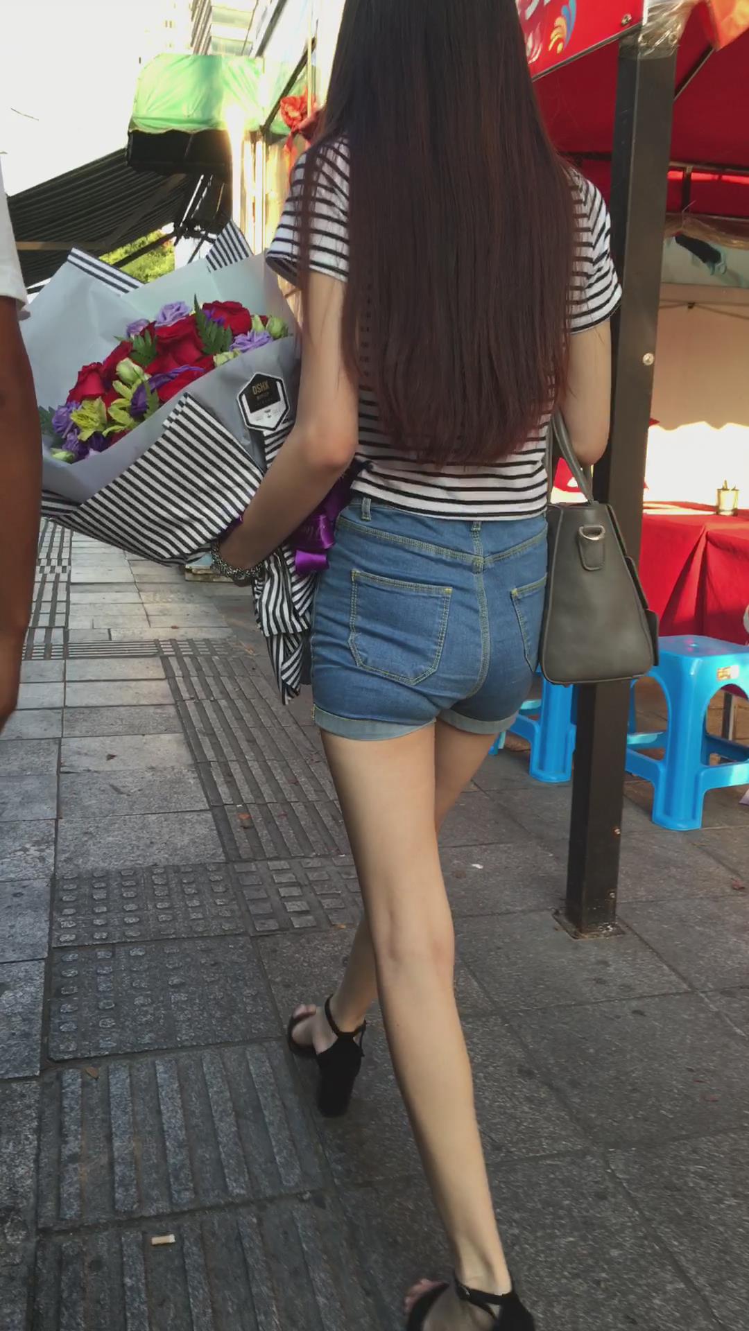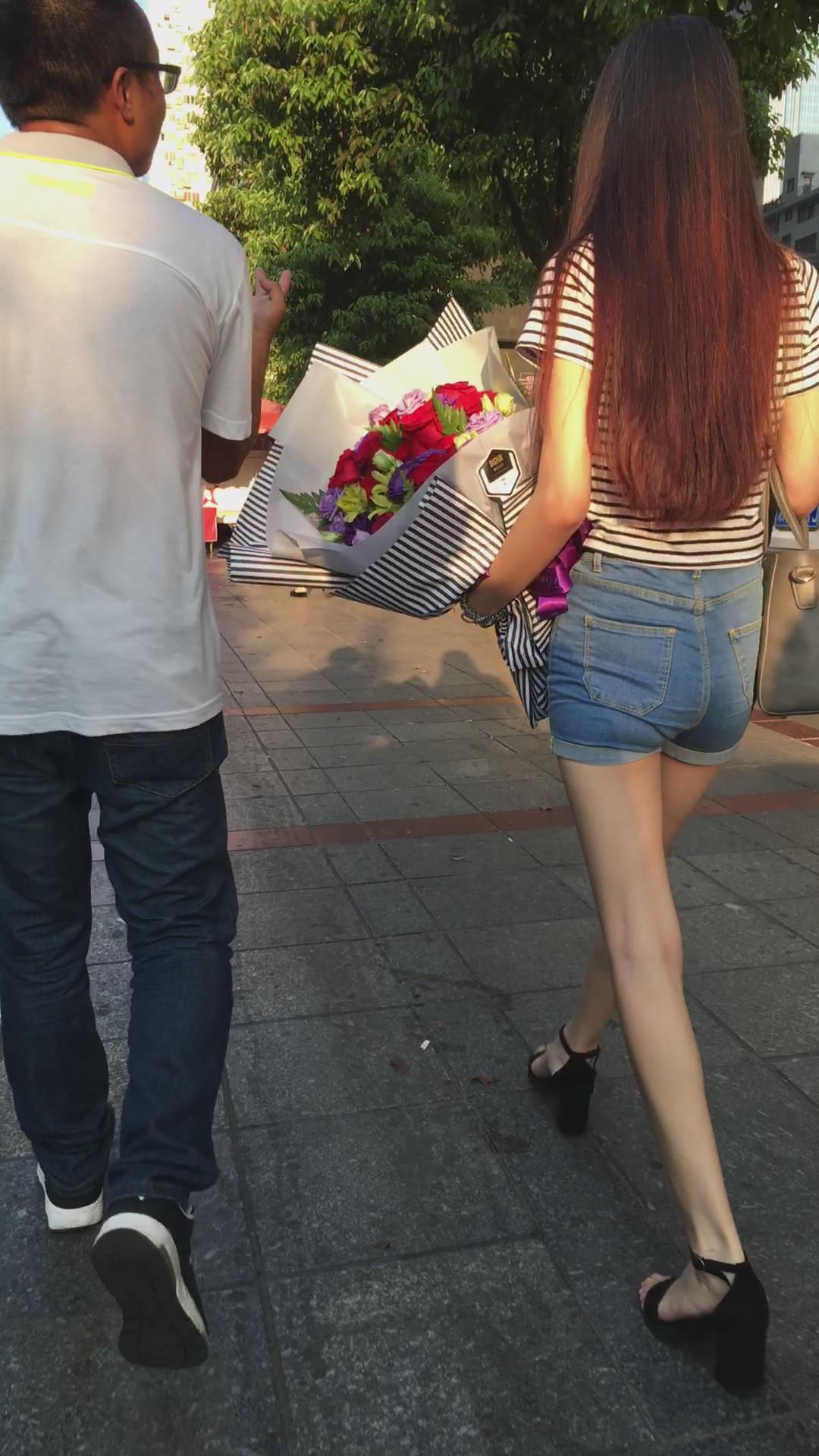 苗条细腿高挑热裤美女收到一束花笑得很开心 编号4192