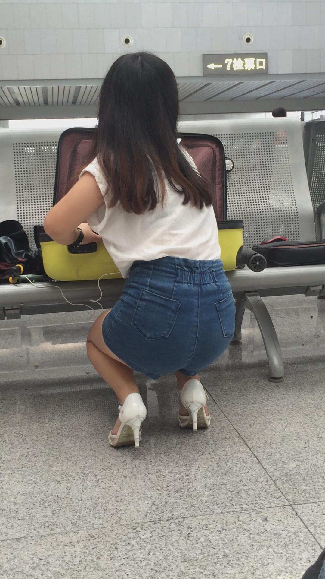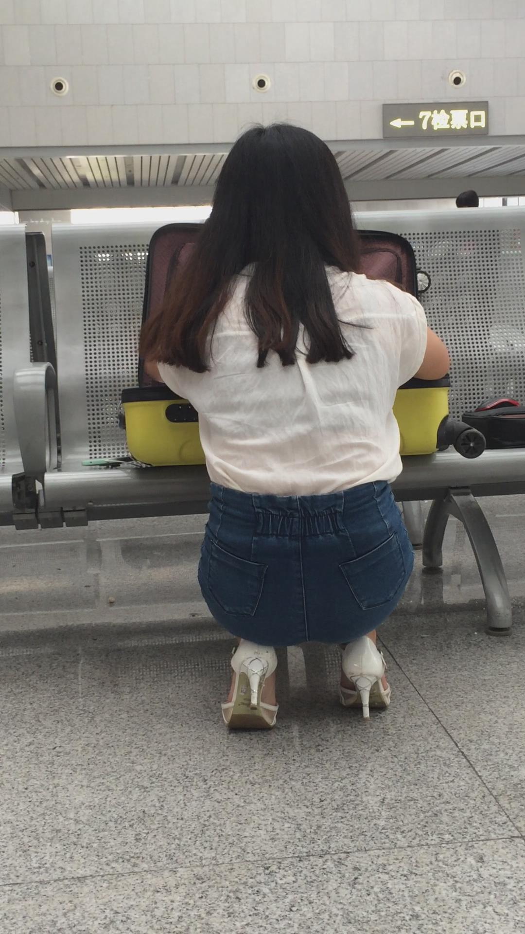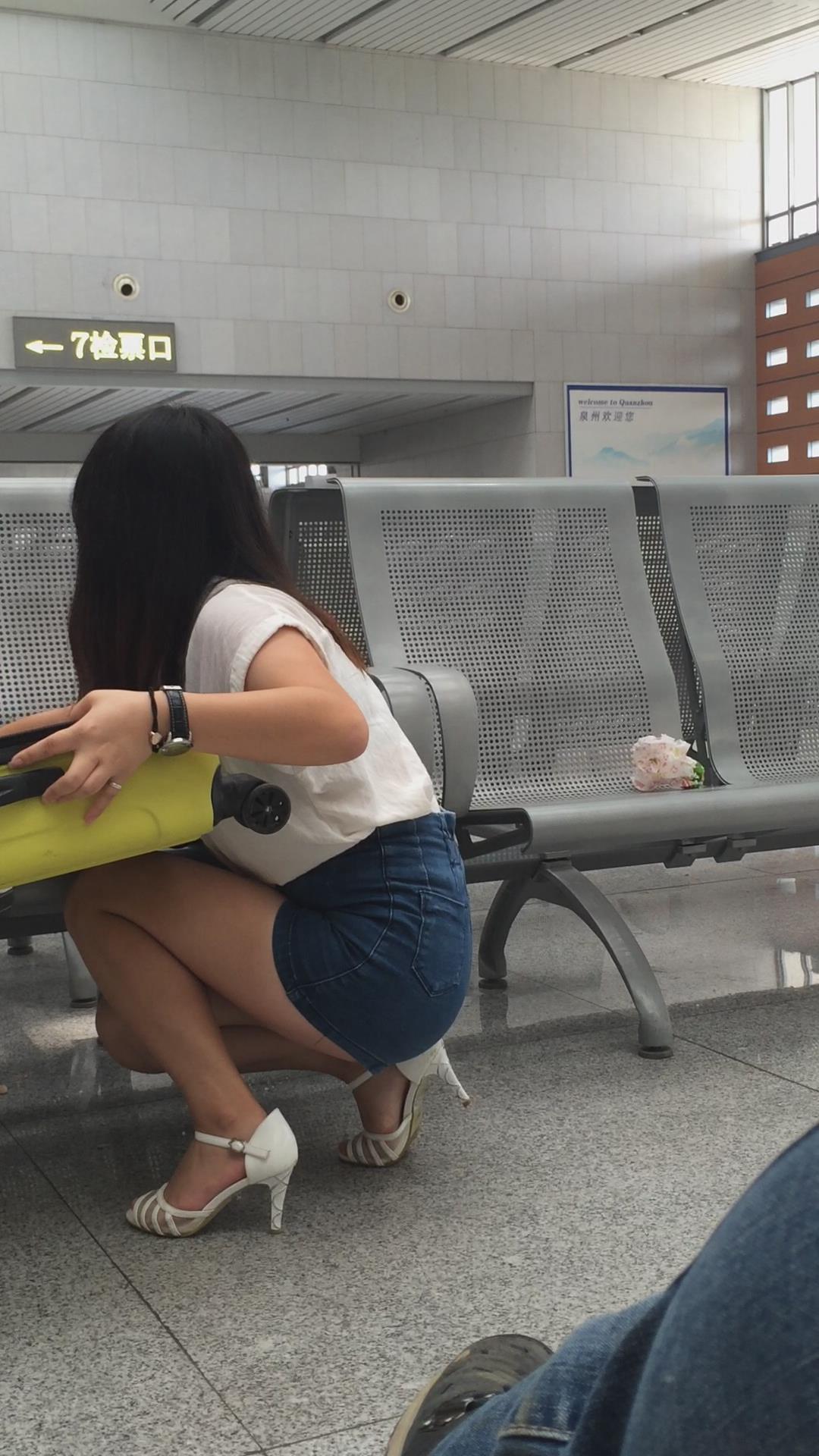 候车室内整理行李的热裤长腿高跟鞋美女 编号4397