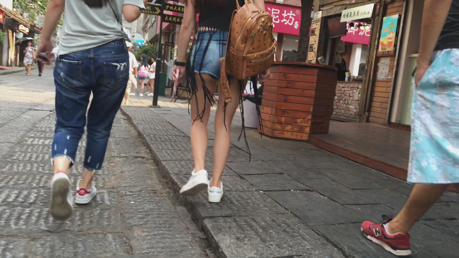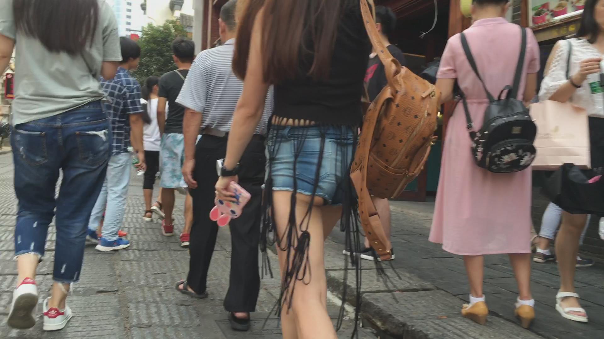 街拍高腰牛仔热裤裸腿圆臀鸭舌帽美女 编号4404