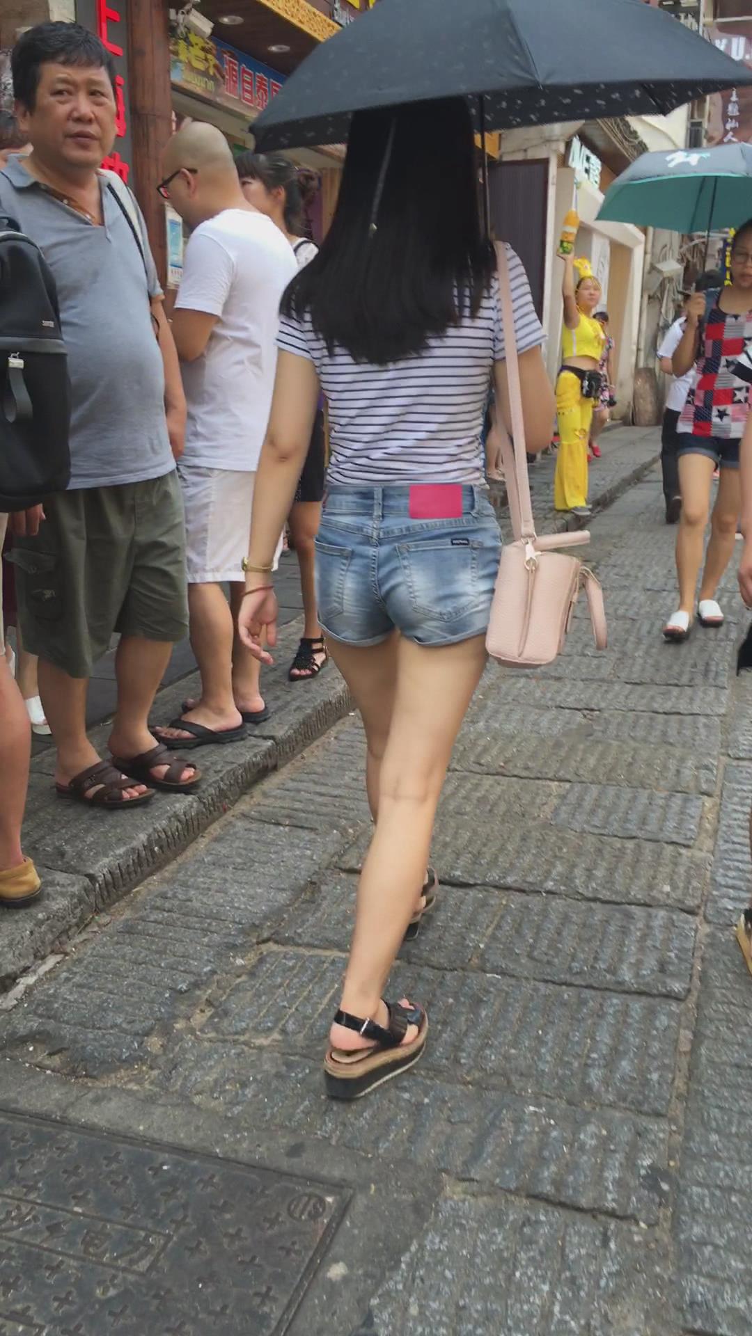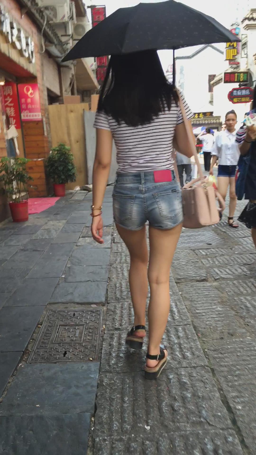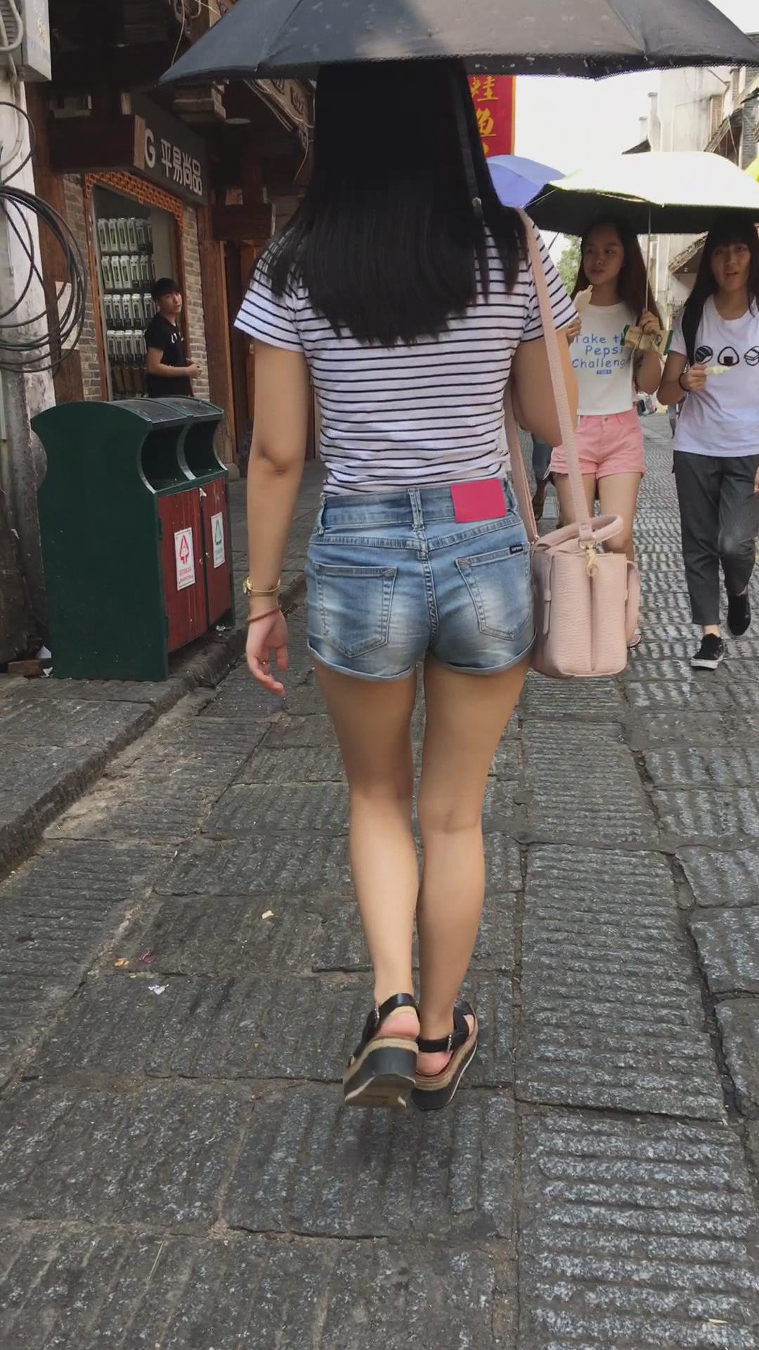 撑伞逛街的牛仔热裤美腿小清新美女。 编号4625