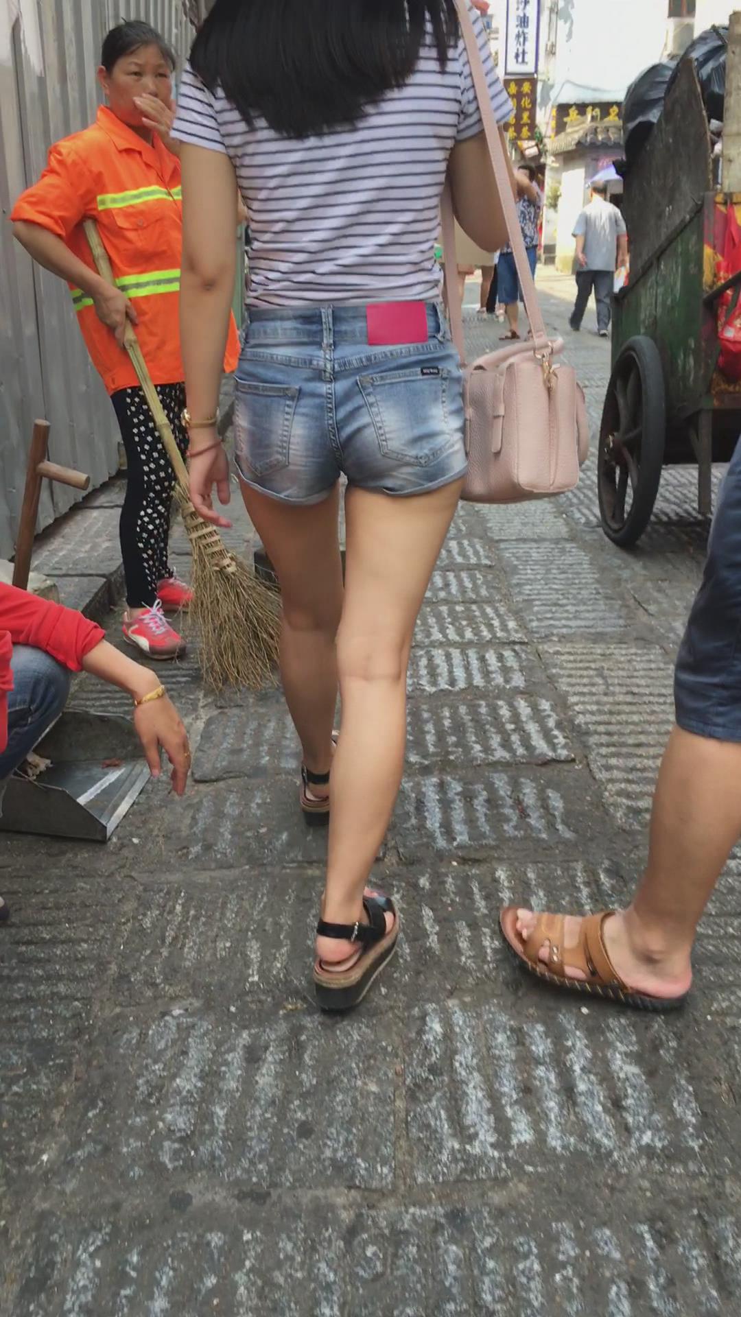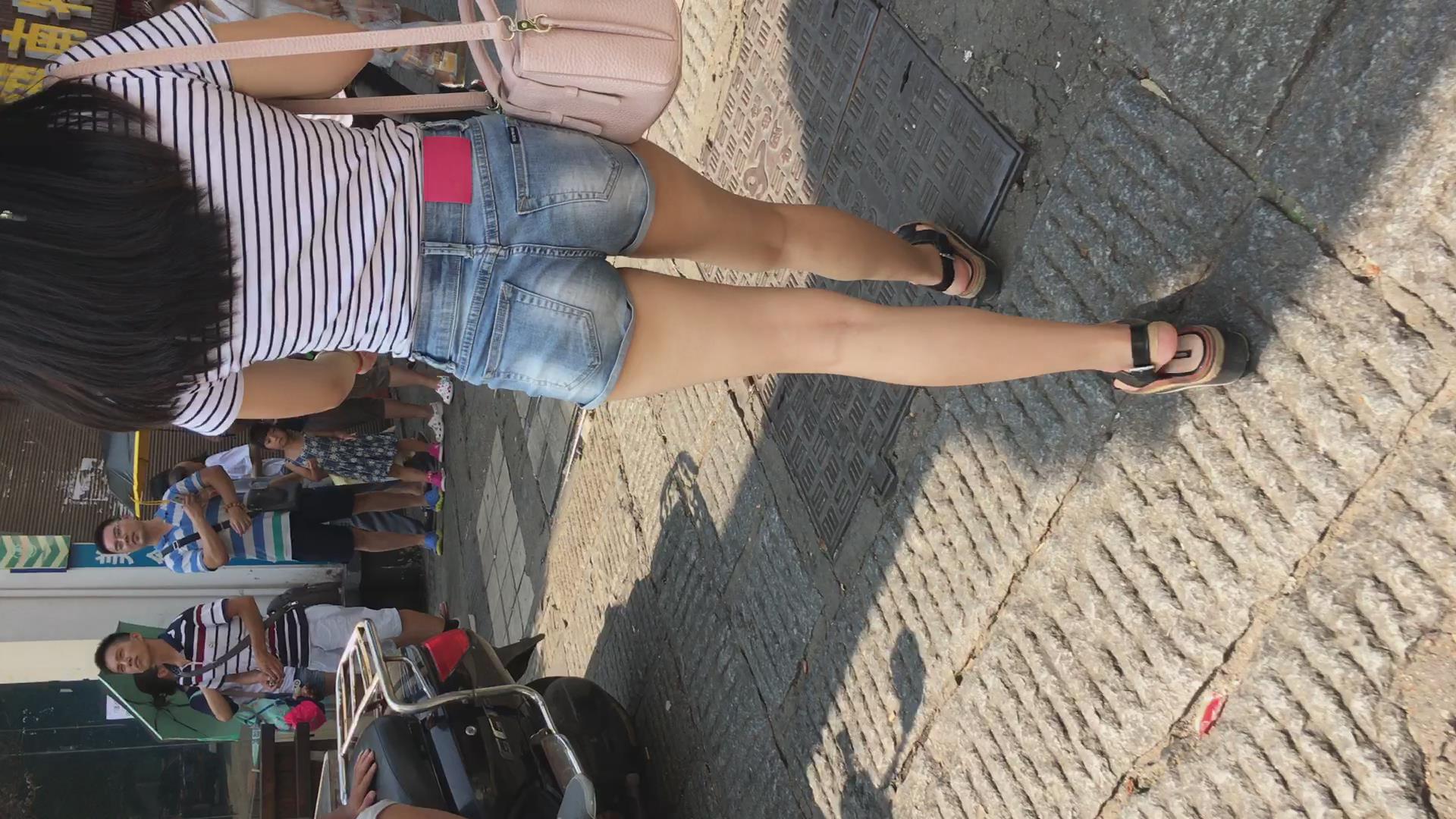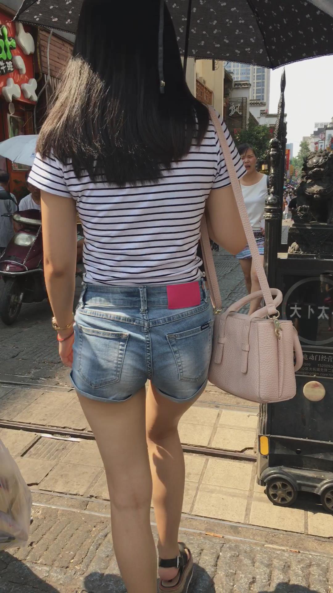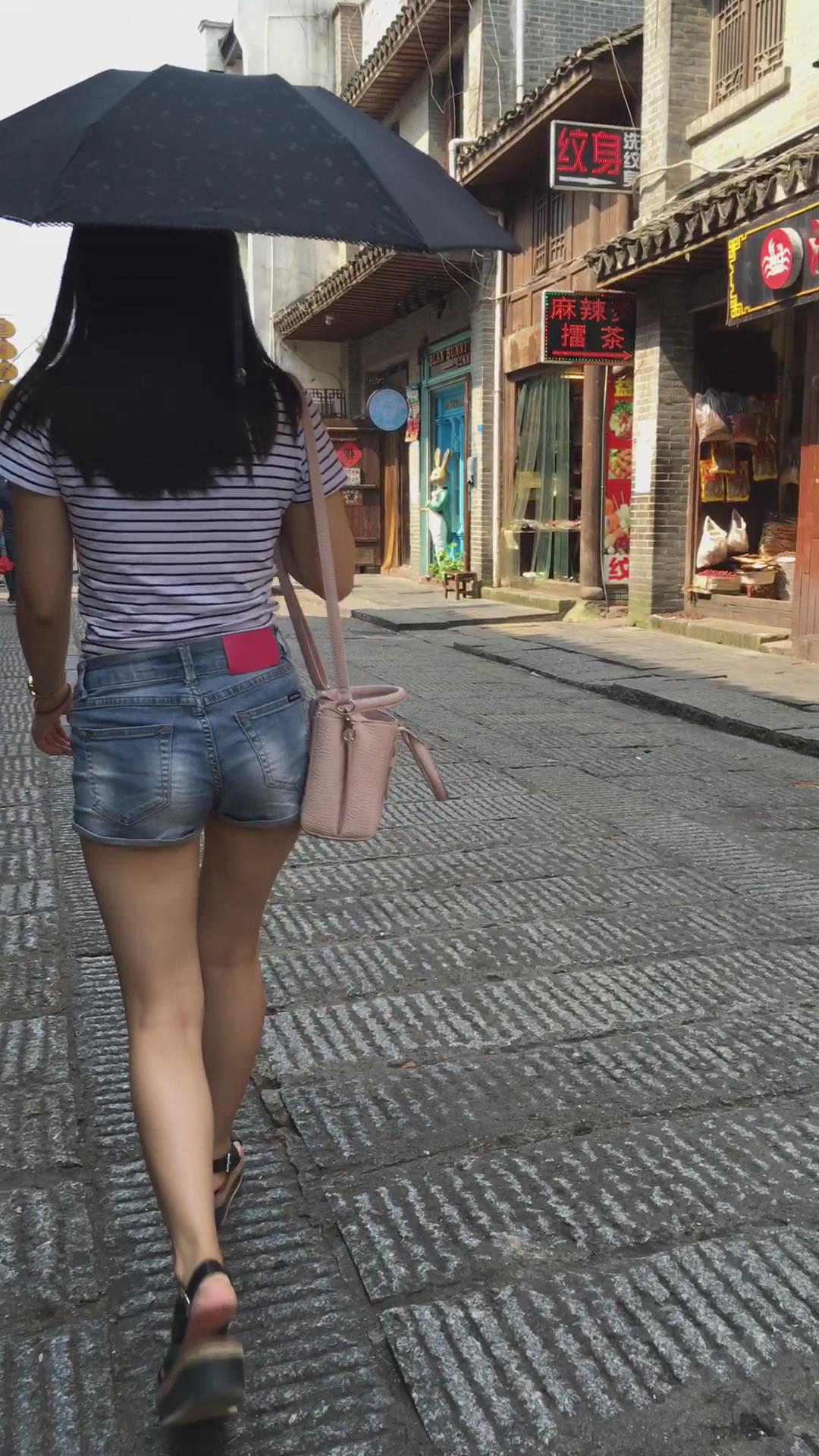 撑伞逛街的牛仔热裤美腿小清新美女。 编号4625