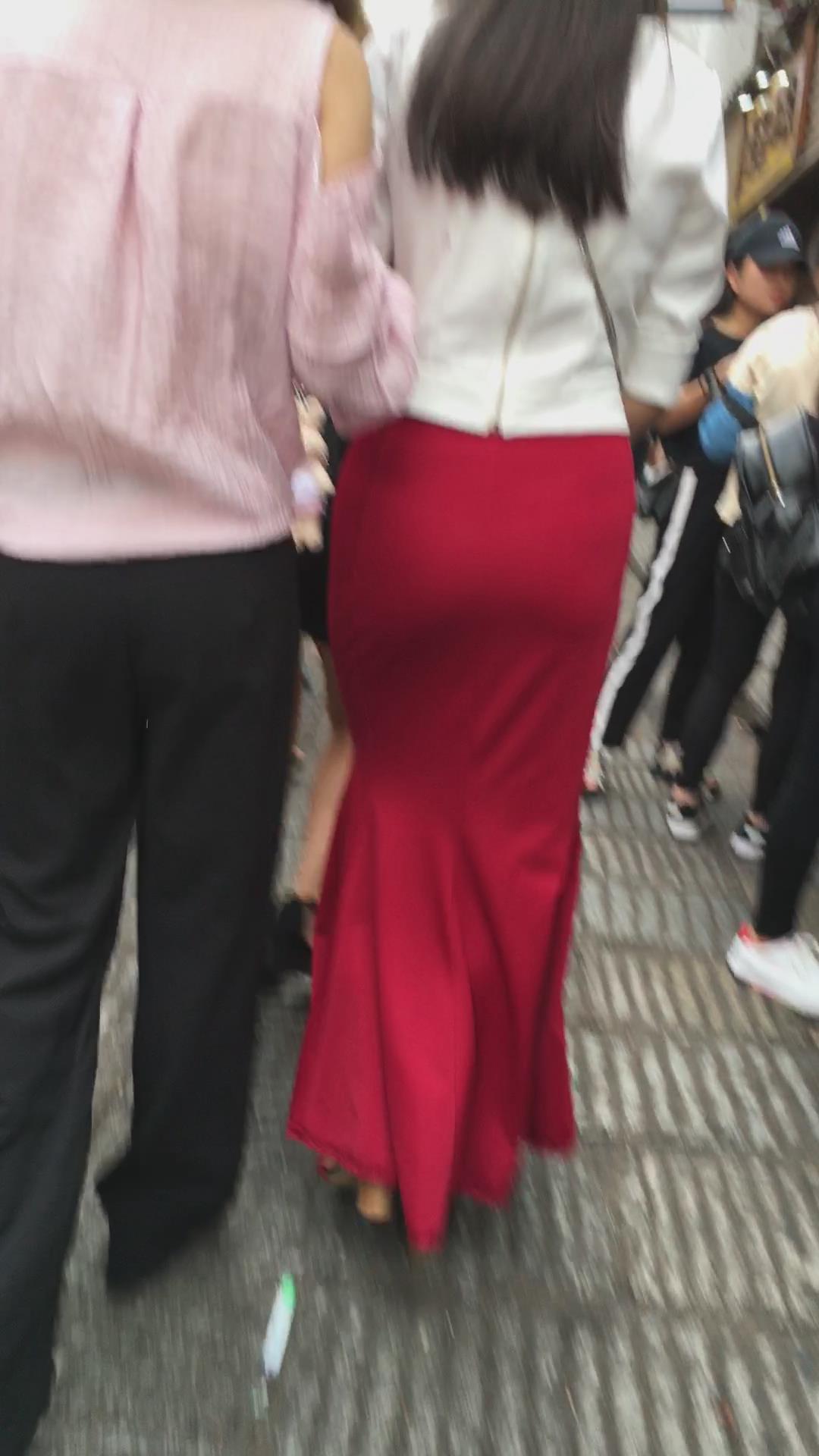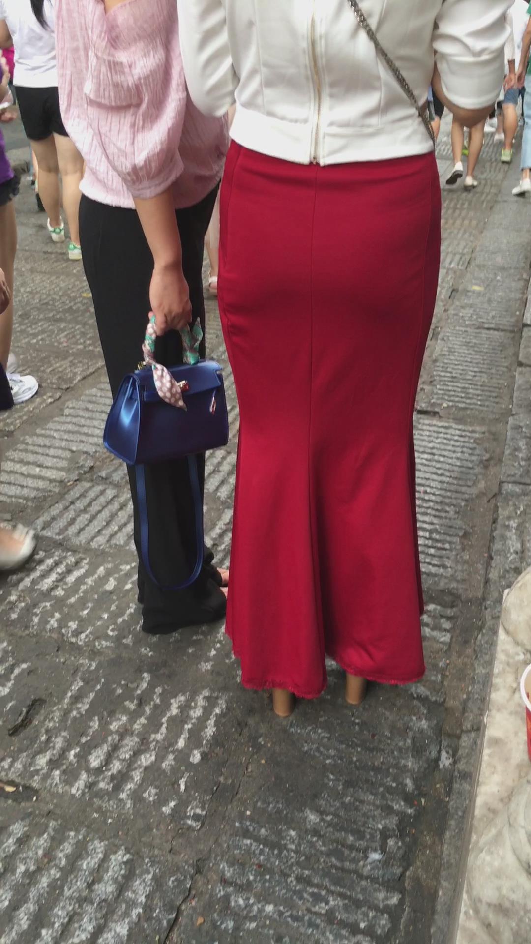 街拍性感丰臀大红色包臀裙华贵美女 编号2192