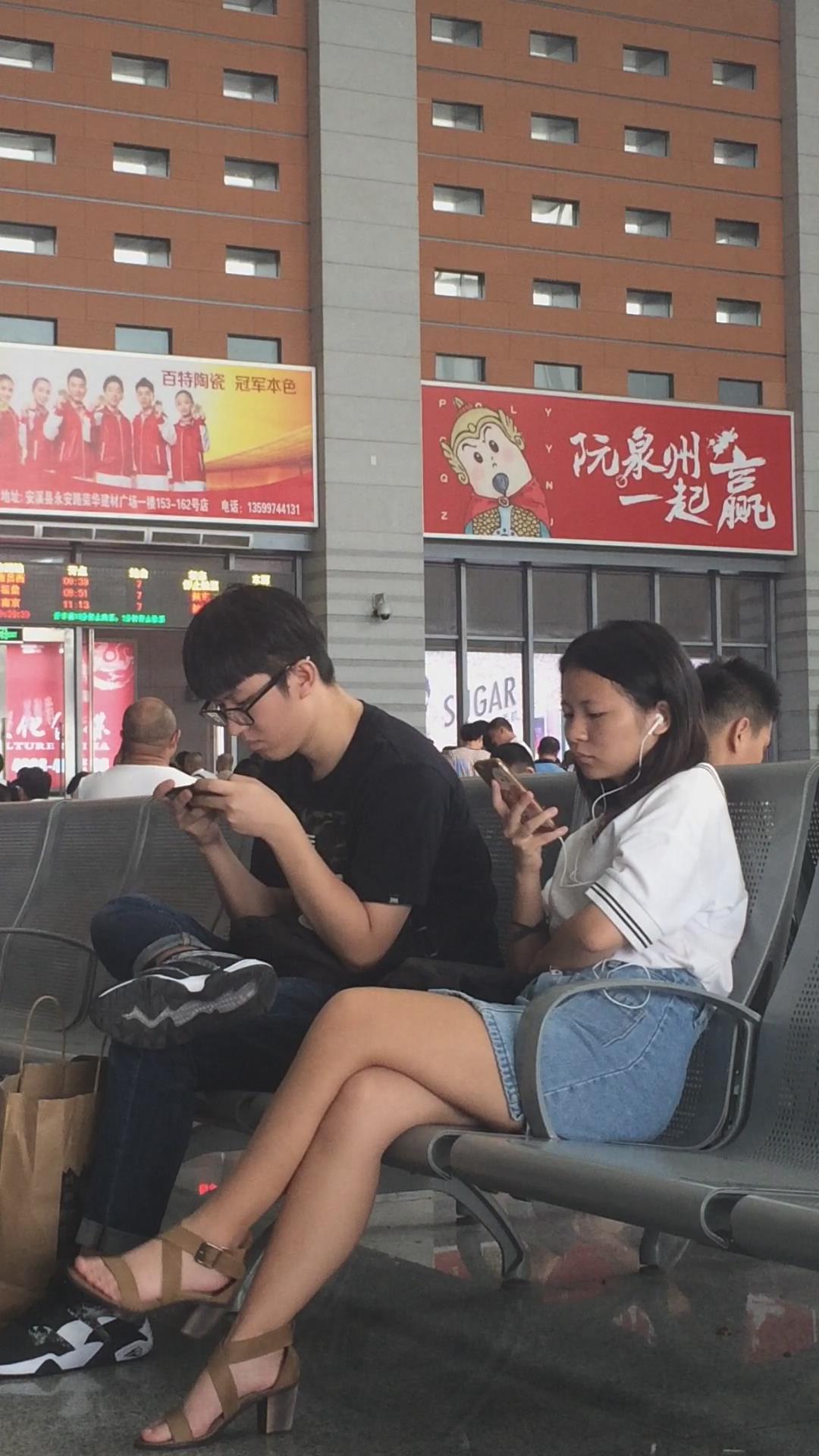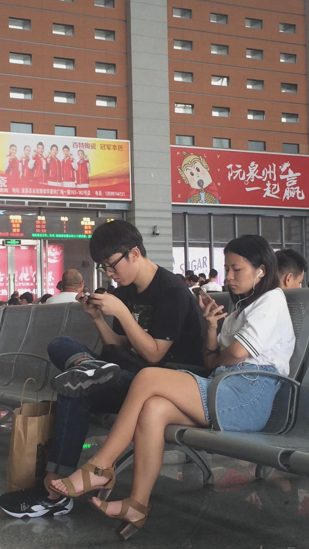 高铁站候车室等车的美腿牛仔裙美女 编号2337