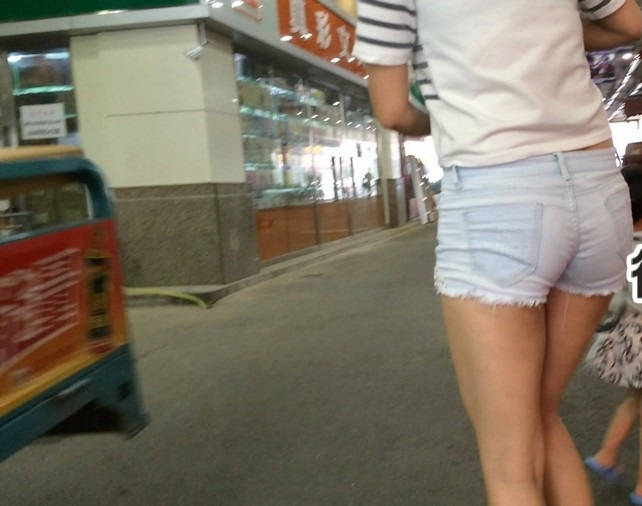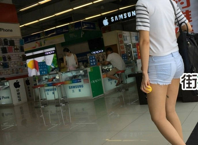 【编号870】街拍牛仔热裤少妇带小孩扫货