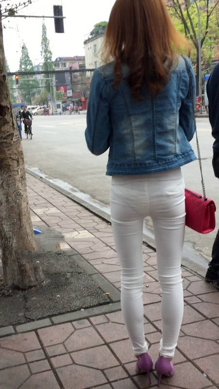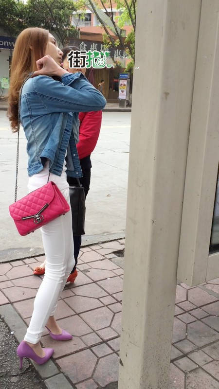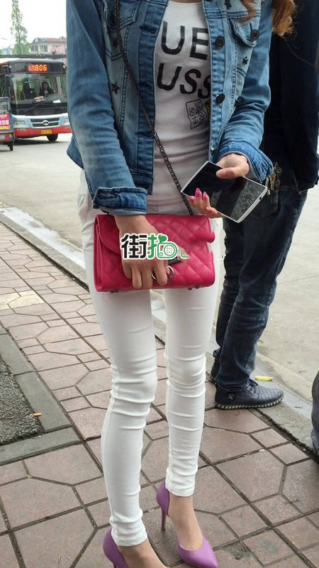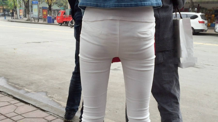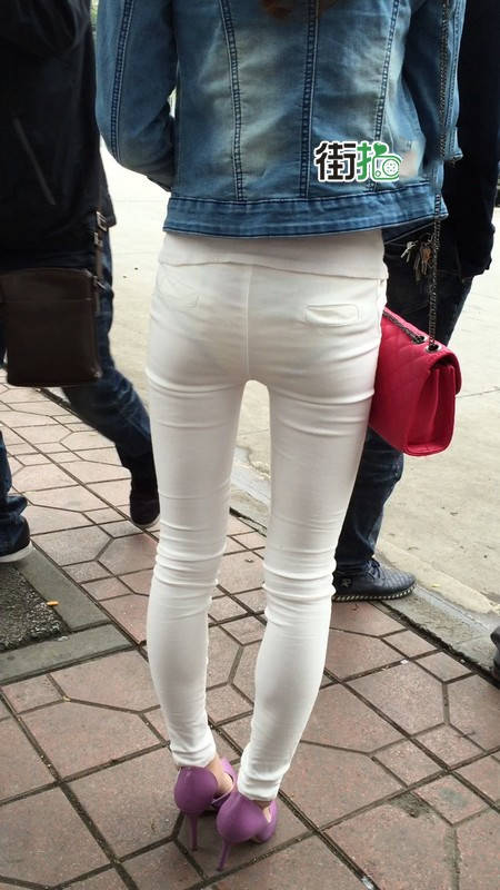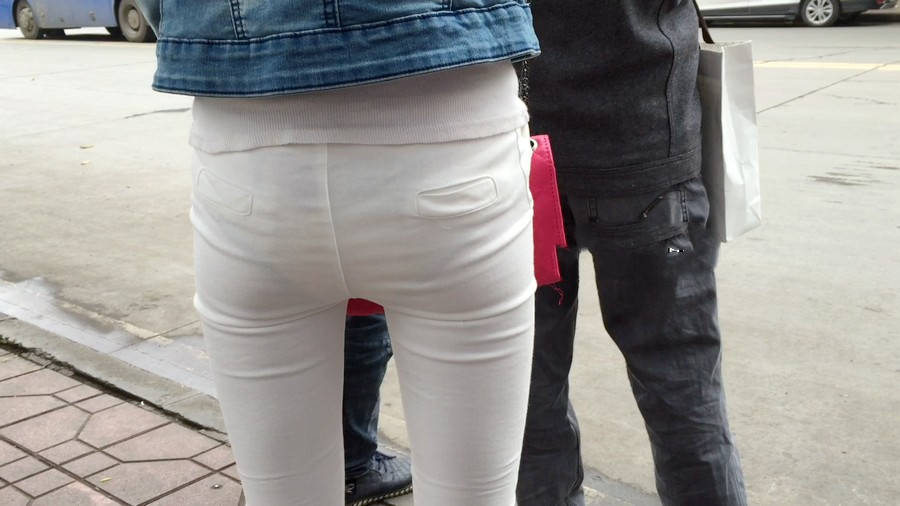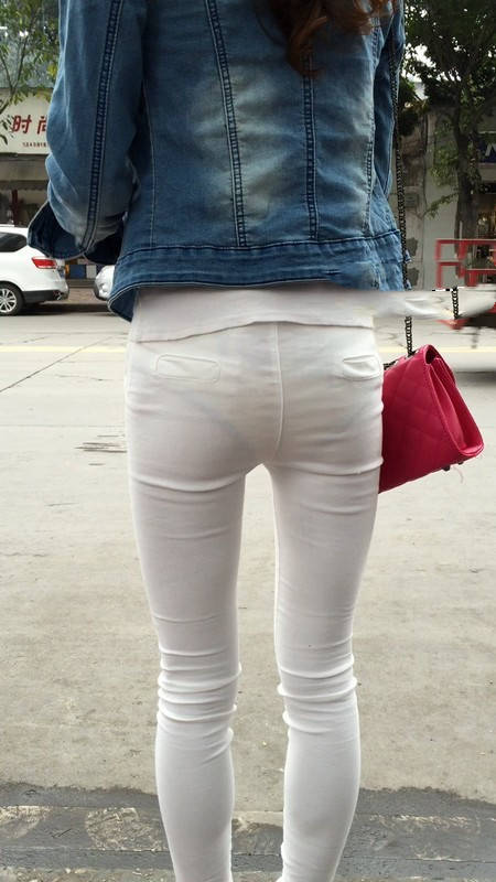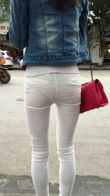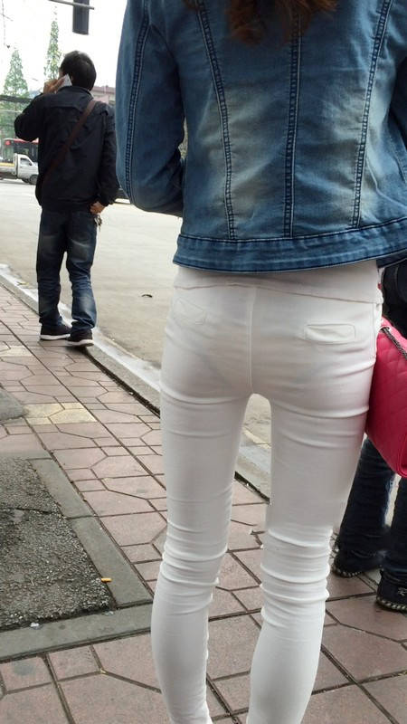 【编号1075】街拍紧身薄透白裤女学生等公交