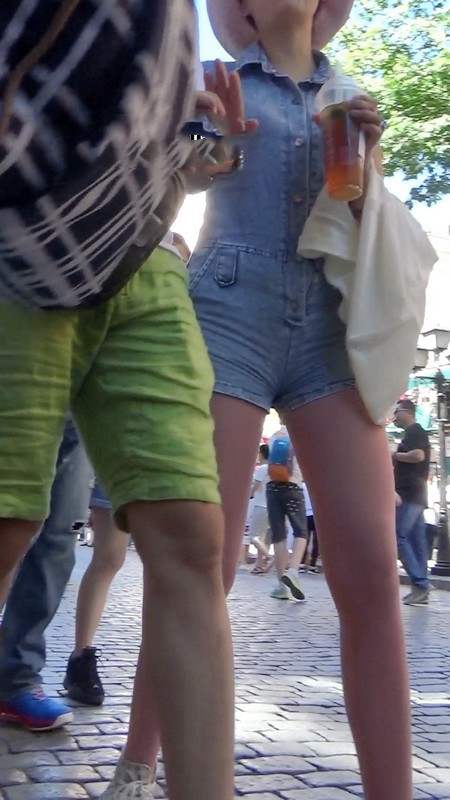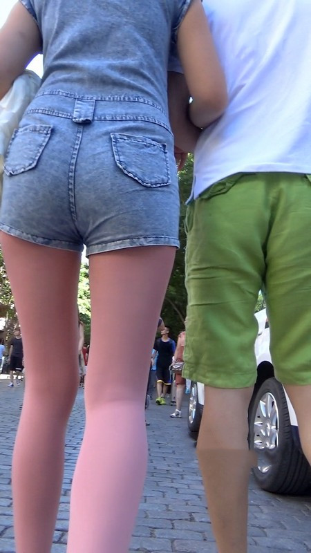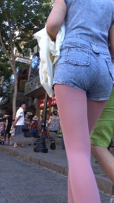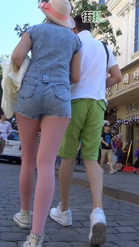 【编号1045】街拍粉色丝袜牛仔背带裤长腿MM